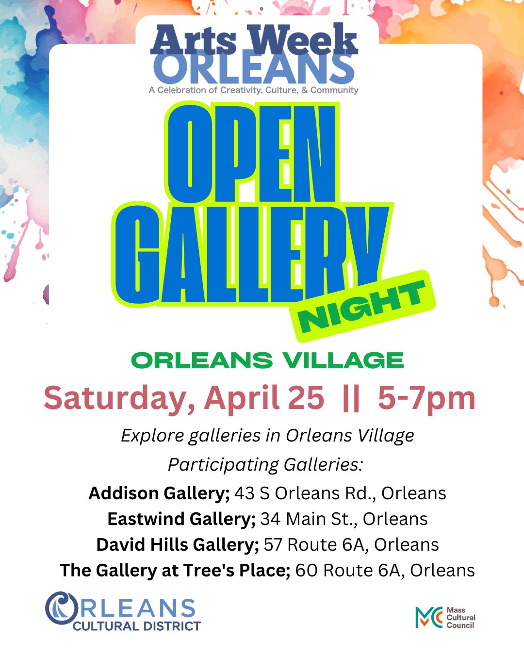 Addison Gallery; 43 S Orleans Rd., Orleans Live music by Larry Murray and live painting by Maryalice Eizenberg, Jonathan McPhillips and Amy Sanders. Plus, learn more about the Arts Foundation of Cape Cod which supports, and celebrates arts and culture of the region, serving artists, all art forms, cultural and historical centers.